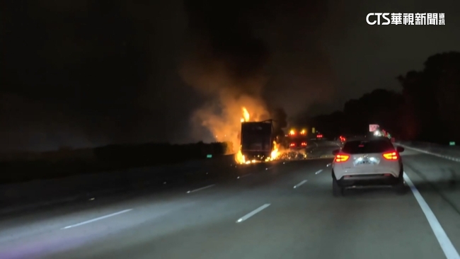 民眾在國道行駛,遠遠就看得到濃煙與火光,路過的車輛都放慢速度,從外線車道繞過去,消防隊員花了10分鐘撲滅火勢,也造成車流回堵2公里,國道警方正在調查,確切的事故原因。大貨車全面燃燒飲料散落一地駕駛及時逃生肇因待查。