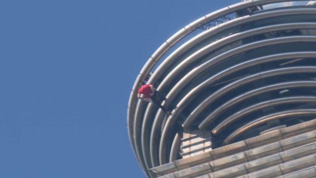 在爬到91層樓,以上的圓球處時,艾力克斯霍諾德,先將左腳頂在下方支撐,接著右腳伸進建築凹槽裡,達到平衡後,再輕鬆自如解放雙手,再換個角度來看,艾力克斯淡定的將雙手,伸向後方粉袋,抹完止滑粉後,繼續向上攀爬,這一幕讓全球觀眾,看得膽戰心驚,不過對艾力克斯本人來說,似乎只是小菜一碟。
