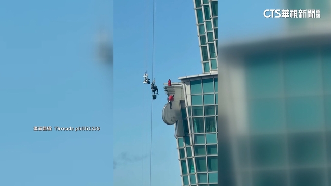 在101大樓玻璃窗外,走在台階邊緣架設機器,辛苦的攝影團隊前一天,就來101模擬演練,而其中這名大鬍子攝影超圈粉,留著濃密鬍子舉手打招呼,露出燦爛笑容,他是這次轉播團隊攝影師Pablo,以拍攝冒險探索類等紀錄片聞名,這次在攀登行動中,負責在倒數第二層的祥雲平台,紀錄Alex 。