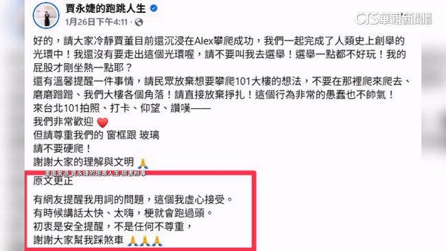 賈永婕發文表示,自己還在享受這項人類創舉的光環,但她在呼籲民眾不要攀爬101大樓時,卻用女性身體來比喻大樓的窗框、玻璃,引發大量網友批評,對此,賈永婕立刻道歉,說自己太嗨了「跑過頭」,沒有任何不尊重。