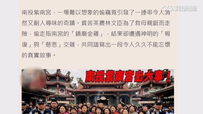 近期一名網紅在網路上PO出一段故事,內容中提到一名男子為了救母親,偷走南投竹山紫南宮內的金雞,最後金雞卻變成千斤重,壓斷他的雙腿,這段故事在網路上流傳,甚至有不少人信以為真,對此廟方出面澄清,強調故事根本不是事實,是有心人刻意捏造。警方提醒,任意散布不實訊息或謠言,已經觸法將會依法開罰。