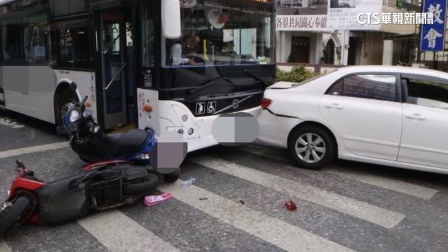 車禍現場一片狼藉,白色轎車引擎蓋都掀起,公車旁邊,好幾部機車,交疊在一起,熱心民眾聽到碰撞的巨大聲響,緊急出來查看,只見現場一團亂,目擊民眾說:「看到機車都是卡在那邊,公車上面也有外國的旅客在旁邊驚魂未定,公車來就沒有煞車就直接撞上去,就是碰碰碰。」