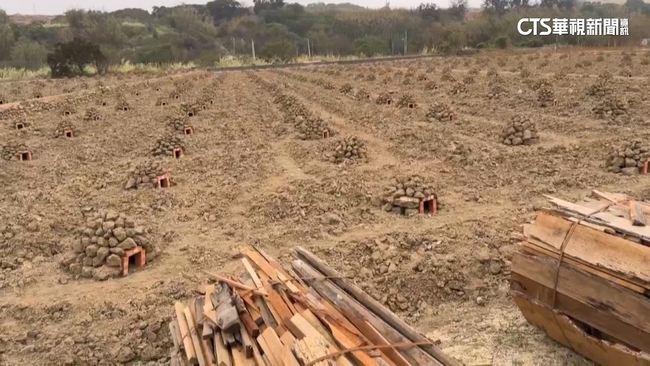 苗栗的農田中,砌起一排又一排石頭堆,中間還用紅磚塊架出一個小洞,總共350堆,遠遠看過去,好像哪裡怪怪的。有民眾路過看到在社群發文詢問,有人知道這是什麼嗎,超級壯觀的,底下網友紛紛解答是控窯活動,還有人留言窯太多有點毛,還有民眾看到貼文特地來到現場看。