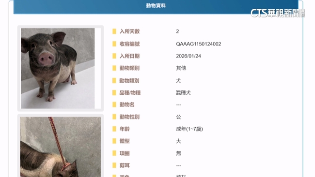 基隆市動物保護防疫所動保員王薏婷說:「寵物銀行平常都是貓狗為主,從來沒有豬出現過,那我們也很急於地要把這個豬安頓好,安置好,所以在系統上面,誤植為犬隻這樣。」