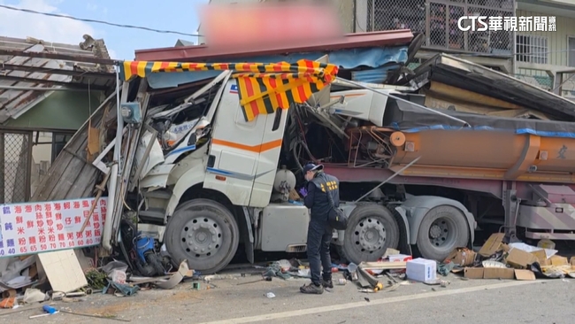 貨車路口處迴轉,對向砂石車來不及閃避,撞了上去,車輛失控再追撞正在卸貨的白色貨車,衝進路旁早午餐店,早午餐店老闆說:「沒有,沒有時間反應啦,它當時就直接(撞)進來了。」