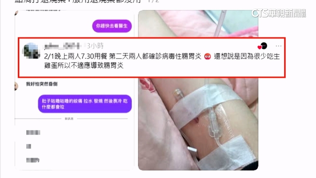 黃小姐說:「3個人吃完之後,我用餐完大概過40分鐘,我當時就開始肚子有點痛。」同行的2名友人加上黃小姐,2月1日吃完餐,就開始肚子痛,黃小姐將狀況PO上網,底下也釣出網友說,同一天吃完,被確診病毒性腸胃炎,懷疑是蛋慕斯不乾淨。