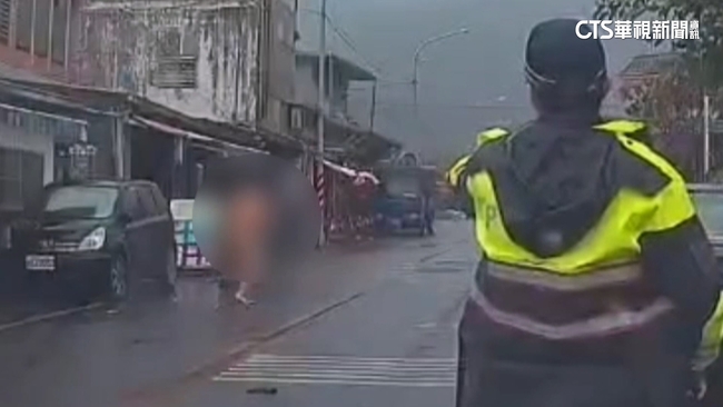 一名裸上身的男子,手持兩把利器衝出家門,嚇得小貨車駕駛趕緊閃避,員警獲報趕到現場,沒想到這名男子卻更加失控,當街拖掉褲子還跑給警察追,員警別無他法只好出手,將他壓制在地。