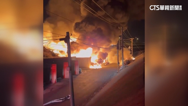 現場烈焰沖天,一大片廢棄物都被大火吞噬,火勢猛烈,還波及到停在一旁的堆高機,和俗稱「山貓」的堆土機,消防局接獲報案,派出21名消防員、12輛消防車趕到現場,迅速拉起水線灌救,所幸沒有造成人員傷亡,詳細起火原因還要調查釐清。
