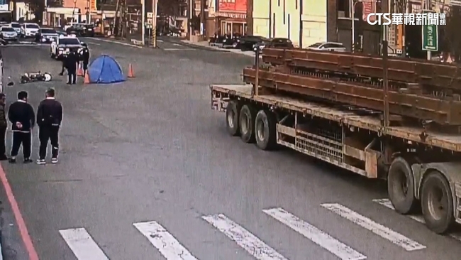 當地民眾說:「警察,救護車都有來,扁掉了,那個拖板車載那個鋼鐵。」機車騎士被曳引車右前車頭輾過當場死亡,警方調查,兩車都是同向行駛,是不是視線死角發生碰撞,還要釐清。