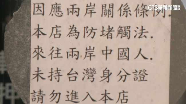 台北市萬華區一間餐廳,老闆在門口張貼公告,寫下「因應兩岸關係條例,為防觸法,來往兩岸中國人,未持台灣身分證請勿進入本店」引起討論;而業者透過律師回應,店內聘雇有中華民國國籍的中國員工,先前員工親友來訪時,幫忙拿東西,遭誤會被移民署偵辦,這公告是為了保護彼此,並非歧視,現在店外的公告已經遮蓋起來,後續將會做更換。