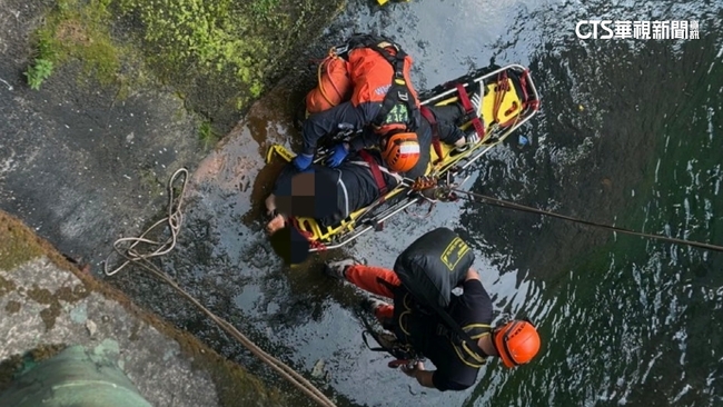 男子重重摔落水泥地,表情痛苦扶著腳動彈不得,好幾名員警在橋上,忙著聯絡消防隊救援,消防人員費了一番功夫,架好繩索把人抬上擔架,慢慢拉上橋面男子才脫困,而他會掉落橋下,竟是為了躲警察。