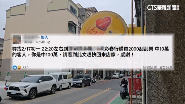 有其他家彩券行業者著急PO文協尋,大年初一晚上10點多到店裡,購買2000元刮刮樂,以為自己只中10萬的客人,快回來因為你刮中的是100萬元。