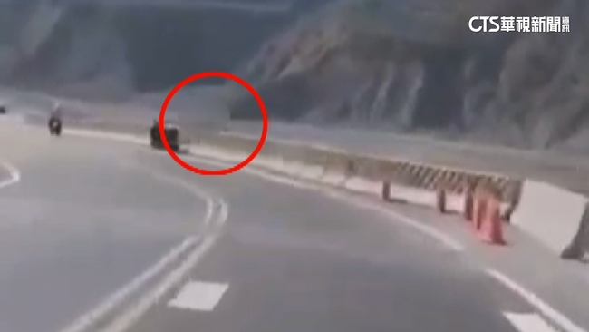 行車紀錄器拍下,前方車輛準備過彎結果突然失控偏移,撞上右側護欄後人跌落50公尺深橋底下,而他的機車則是在無人駕駛狀態,一路往對向衝了過去,第一時間兩側都揚起大片煙塵,驚悚一幕讓後方的車輛嚇壞,趕緊停下幫忙。