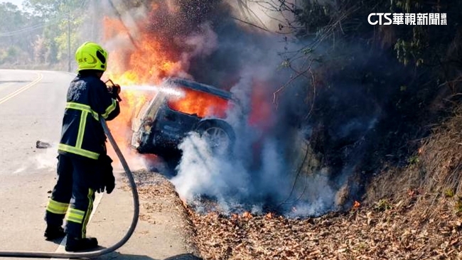 休旅車停在路邊整輛車燒成火球,冒出大量濃濃黑煙,消防車抵達現場,搭設好水線朝起火燃燒的休旅車射水,經過一段時間火勢終於被撲滅,車輛起火的地點,在苗栗縣西湖鄉苗28線,72歲吳姓男子,22號下午開著休旅車,經過這個路段要去工作,沒想到路中間突然衝出一隻狗,吳姓男子為了閃狗,整輛車滑入路側水溝接著自撞路邊的水泥牆,隨後整輛車起火燃燒。