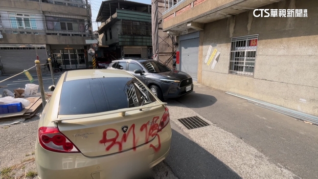 巷子口停放著一輛轎車,但仔細看車殼上被噴了,紅藍兩個顏色的噴漆,車尾還被大大寫下別停兩個字,附近民眾說:「車子停一半,停在那邊,出入的車子很多,也不知道誰給它噴漆,噴漆給它噴勿停,理論上停在那裡也很奇怪,剛好彎過去的地方。」