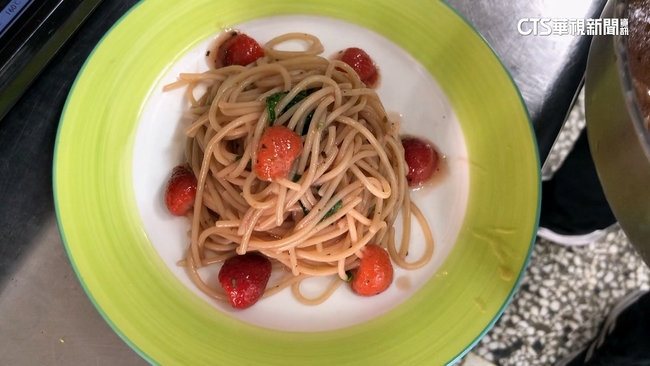 清炒義大利麵香氣撲鼻,和配料一起攪拌,但等等你沒看錯,在鍋裡的是草莓,粉色的草莓義大利麵上桌,先直接吃清爽帶點草莓香,再加入草莓醬一起吃更濃郁,兩種風味不同口感,顧客直呼特別。