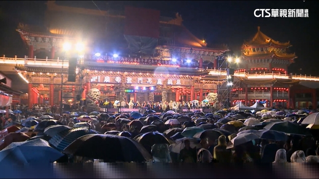 主持人:「是我們台南市。」就算天空不作美,飄起毛毛細雨,仍不減活動熱鬧程度,民眾紛紛撐雨傘,現場還施放蜂炮驅邪,共有十二座蜂巢式巨型炮台,一系列活動沖蜂炮、搶春牛、高空煙火秀,廟方表示,希望能讓更多年輕世代認識傳同文化在媽祖護右下迎接新的一年。