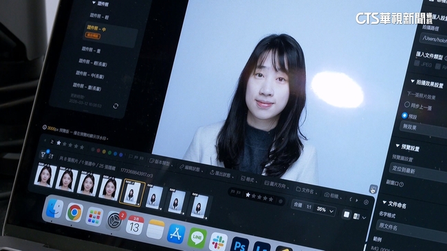 燈光架起擺好姿勢,按下快門,想要拿到證件照,不用再花時間等,快速一修,選擇想要的妝容再把瑕疵消除,原本用一般軟體,需要修到半小時以上的照片,用AI軟體與辨識,就即時完成只要10分鐘,照片快速列印到手。