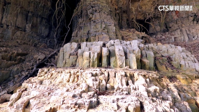 有如羅馬神殿的列柱景象,出現在苗栗永和山水庫內,因為蓄水量下降,邊坡再度露出列柱奇景,連淹沒在水裡的土地公廟、廖家古厝也露出來了。
