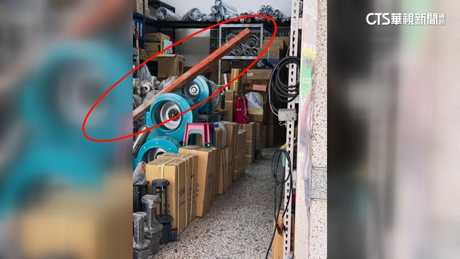 五金行老闆娘說:「我跟我們老闆還站在這個位置卸貨,進去沒多久,待久一點就可能不是站在這邊,就躺在醫院裡面了。」幸好鋼樑墜落,五金行店內老闆跟老闆娘沒有遭波及受傷,但這麼大一支鋼樑飛進店裡面,除了造成店家戶外遮雨棚鐵架受損,牆面上的磁磚也出現些微剝落。