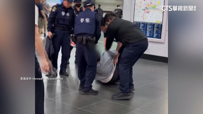灰衣男子躺在地上,好幾名員警,試圖拉他起來,但男子始終不配合,車站大廳,員警無奈只能一路,拖著男子前進,原本坐在車站大廳,休息的民眾見狀,紛紛起身閃避。