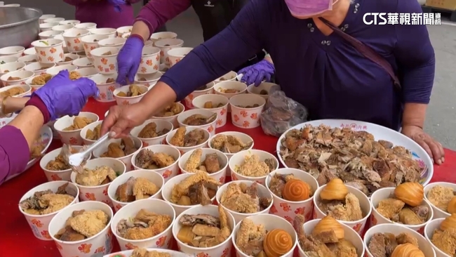 大鍋翻炒,油油亮亮的滷肉出爐,還有炸的黃金酥脆的雞翅、小饅頭,裝在碗裡看起來超澎派。民間習俗中,農曆二月初二是土地公生日,以泡麵土地公聞名的,南投縣中寮鄉石龍宮,現場不只有免費泡麵可以吃,還準備了5千份平安餐,10點半開始發送,就吸引民眾大排長龍。