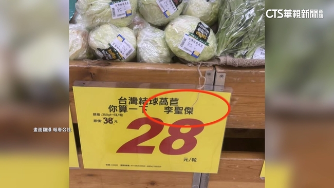 有大賣場,架上1款台灣結球萵苣,價格牌上寫著「你算一下」「李聖傑」,民眾發問:這跟李聖傑有什麼關聯?許多網友解答,這是台灣最近很夯的姓名諧音哏,「你算一下」的台語發音相似李聖傑。有人認為「這家小編有跟上時事」,但也有人認為「看不懂的東西當有趣,有些跟沒寫一樣」。