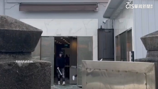 嫌犯說:「走走走。」整群凶神惡煞,手持棍棒到場鬧事,砸完店要離開,還不忘再捕幾棒,時間回到幾分鐘前,一連三台汽車,排排站停靠路邊,車門一打開,整群遮臉的黑衣人氣勢洶洶下車,隨即衝進一旁的殯葬會館,一陣亂砸。