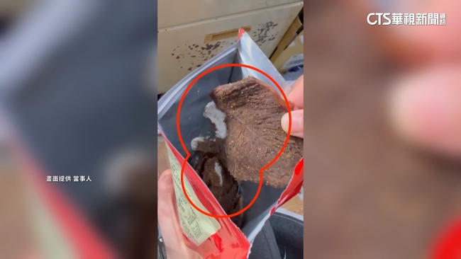 當事民眾說:「發霉耶,(太快了吧)。」拿起厚厚的牛肉乾,有一大片面積,被白色物體覆蓋,仔細看還有毛毛鬚狀的感覺,讓民眾驚呼直指發霉了。當事民眾說:「(你是放在多潮濕的地方),沒有沒有沒有,應該是他們加工自己的問題。」不只一片,底下另一片也出現同樣情況,當事民眾質疑,伴手禮名店加工有問題。
