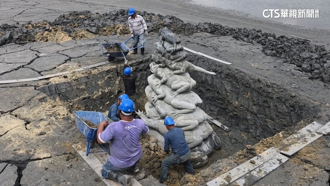 工作人員一鏟一鏟,將泥沙挖出來,這裡是南投日月潭知名的九蛙疊像,碰上全台水情嚴峻,日月潭也因為水位持續下降,在朝霧碼頭不僅岸邊土坡裸露,出現滿地裂痕,九隻青蛙也難得全數露面。