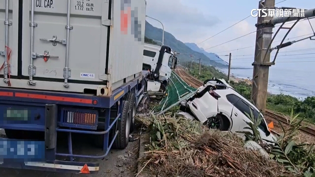 台2線118公里,今(30)日午間發生連環撞事故,當時有一部貨櫃曳引車行經此處,疑似右前輪爆胎,直接朝路旁五部車撞了上去,一部電車在路中央轉了好大一圈,另一部休旅車更是衝出護欄,卡在鐵軌旁邊坡,幸好所有人員都沒有大礙,而整起車禍一度讓台鐵誤點。