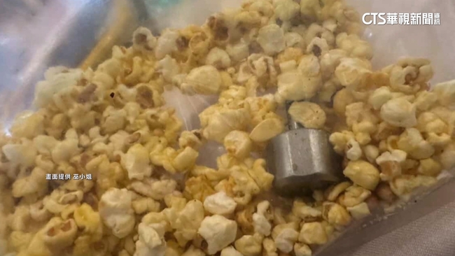 顧客巫小姐說:「我一開始以為是說,會不會是爆米花都黏在一起,就有一球這樣子,後來撥開發現,嗯,怎麼是一個螺絲這樣子,看到那個之後就覺得,這幾天吃的裡面,都有包含這個東西,就會覺得,滿可怕的。」