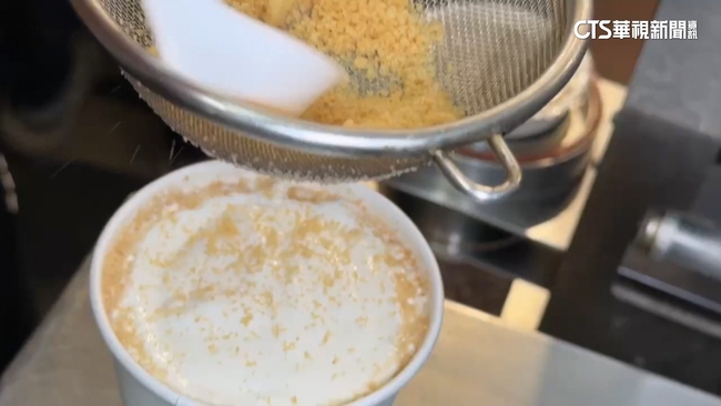 紅茶加入滿滿奶蓋,再撒上壓碎的蝦味零食,插上一根蝦味條,不只這杯蝦味紅茶,還有這個蝦味蛋吐司,多到滿出來的蛋沙拉,結合經典零食,這組合大家覺得「夠蝦」嗎?