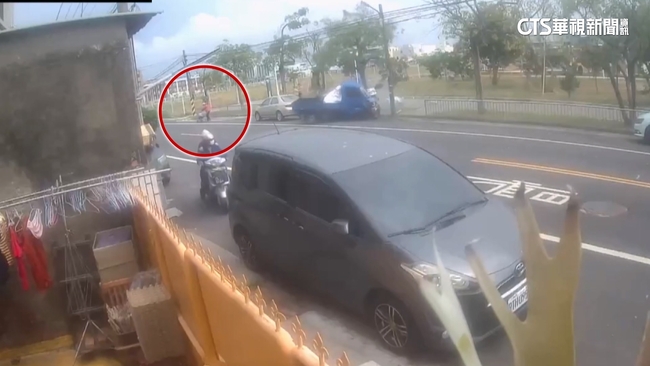 警車鳴笛要圍捕,不久竊嫌開的藍色小貨車,整個大失控,直接往路邊撞,撞車後,竊嫌下車丟下車子落跑,幾名員警追上去,從另一個角度監視器畫面看到,警車直行要攔截竊嫌,結果竊嫌逆向,直接衝撞警車,最後再自撞,圍捕過程中,有位紅衣阿嬤,當時剛好路過被撞的轎車旁,不到10秒鐘,小貨車就撞過來,阿嬤驚險逃過一劫,險被撞阿嬤說:「就這樣走就突然「砰」的一聲好大聲,我一轉頭過去看,阿娘喂,就在我後面而已,我嚇一大跳。」