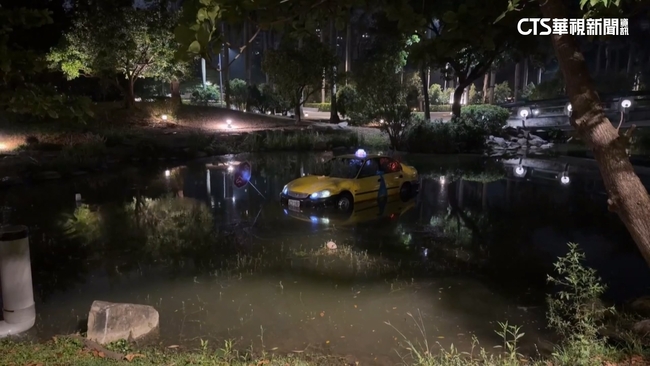 小黃計程車,掉進湖裡,民眾隱約還聽到有男子講話聲音,散步散到一半,看到這畫面,真的讓人捏把冷汗,原來這是高雄美術館的裝置藝術,不過還真的有人信以為真,打電話報警,民眾說:「有人去報警,說還有人在上面。」