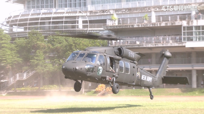 還有這架,NEW ARMY字樣的黑鷹直升機,從台中新社升空,飛來逢甲大學,試降在操場揚起陣陣粉塵,民眾說:「覺得滿興奮的,因為平常能看到直升機的機會不多,難得可以在學校裡面就能夠看到,直升機這麼近距離的起飛。」