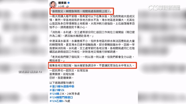苗栗縣長鍾東錦在社群平台上,PO出中港溪溪水暴漲的畫面,更下令正在休假的相關局處首長,通通銷假上班,並強調自己一早便緊盯淹水狀況,不過,民進黨縣議員陳光軒質疑,不少鄉親反映逢雨必淹的地方,縣政府這幾年沒有具體作為,更不見積極預警,應該要面對問題。