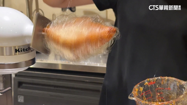 拔絲過程不但療癒,加了一層糖衣的可頌,更是增添口感層次,視覺和味覺雙重享受,台中拔絲可頌業者說:「把(可頌)表面的糖漿,轉化成更現代的一個藝術語彙,然後去給可頌一個更新的,現代的呈現的方式。」