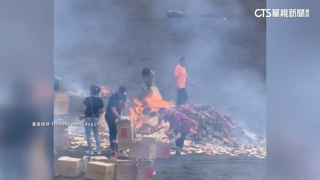 絕美海邊濃煙密布,沙灘上一疊又一疊金紙,堆得像一座座小山燃起熊熊火光,一旁工作人員,還不斷整箱整箱繼續倒,一邊在掃一邊在燒,掃把所經之處,煙塵直衝天際,沙灘上,不只留下大批灰燼,還有一張張金紙,飄落在地。