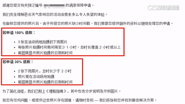 當事旅客樂擎說:「然後那個照片當中,你還要有確切說,你真的在這個地點拍照,然後你要真的顯現出,今天是幾月幾日幾點,然後呢在這邊,然後每間隔一個小時拍一次,然後他們才符合說100%退款的條件,所以我就覺得說,這個要求非常不合理。」