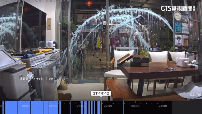一名身穿帽T,用帽子將頭包住並戴上口罩的人,手中拿著一罐油漆鬼鬼祟祟來到店家前,接著就將手中的油漆罐,朝玻璃門狂潑來回潑了好幾下,把店家整片玻璃門都潑髒了再快速離開現場,整個犯案過程,兩個角度都清楚被監視器錄下。