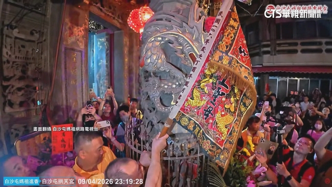 吉時一到,轎班人員將頭旗,掛在白沙屯拱天宮廟門的龍柱上,宣告白沙屯媽祖進香活動,正式開始,白沙屯媽祖進香將在12日起駕,廟方循往例,起駕前3天午夜舉行「放頭旗」儀式。