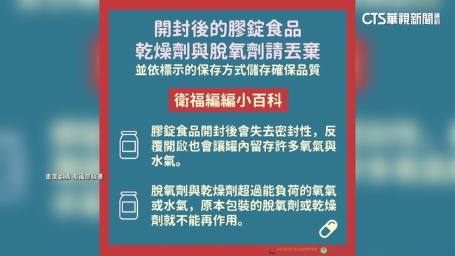 不少民眾有食用保健食品的習慣,不過有藥師提醒只要一開封,裡面的乾燥劑必須馬上取出。