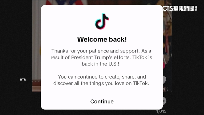 川普還說在他發出行政命令之前,任何協助TikTok恢復服務的公司、將可免除任何責任,不會受罰。消息傳出後,TikTok回來了,恢復對美國用戶的服務,TikTok還發表聲明,感謝川普出澄清與保證。