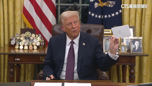 美國總統「川普」宣誓就職後,在白宮橢圓形辦公室,簽署一連串行政命令,在媒體記者的提醒下,找到前總統「拜登」留給他的信。