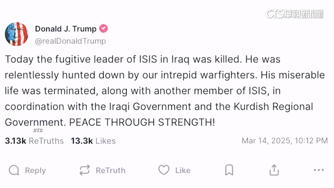 部署在中東地區的美軍「中央司令部」,公布了空襲轟炸的畫面,向全世界展示這項軍事行動的重大成就。美軍和伊拉克安全部隊,花了兩年的時間追蹤,並在過去六個月取得突破進展,發動攻擊成功擊殺「魯法伊」。美國總統川普總統,也在自家社群平台,發文說「以實力換取和平」,證實這項軍事行動。