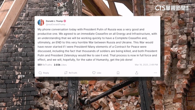 烏俄戰爭出現進展,美國總統川普,美國時間18日,跟俄羅斯總統普丁,進行長達90分鐘的通話後,雙方宣布俄國同意部分停火30天。CNN記者阿貝爾說:「雙方都表示,通話結束時,雙方同意暫時停止,對能源基礎設施的攻擊。」