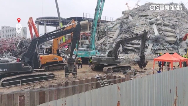 重機具在今(30)日中午過後,增量進駐停滿現場,搜救人員也來回穿梭,跟時間賽跑,重機具分進合擊,有的開挖建築物本體有的清運周圍,但每個動作都小心翼翼,因為底下還有等待救援的人們,也有許多焦急的家屬趕到現場,哭到雙腳癱軟站都站不住,其他家屬也不斷低頭啜泣,一心一意想找回家人。