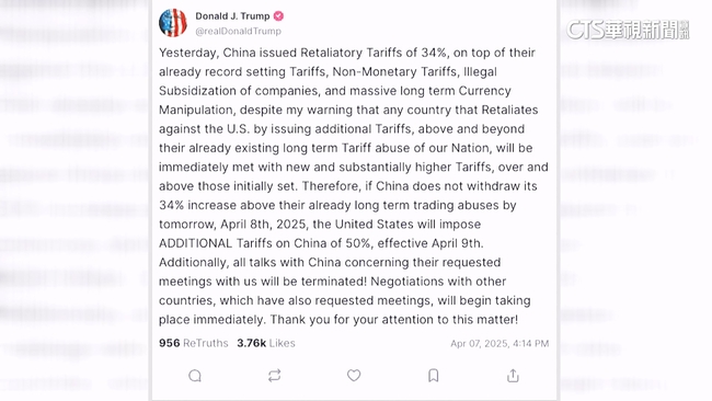 美國實施「對等關稅」的日子就在4月9日,按照白宮說法,有50多國趕著與白宮商量談判。這些國家當中顯然沒有中國。因為川普有貼文表示,如果中國沒在4月8日前撤回對美國課徵34%的報復性關稅,自4月9日起,他將對中國在34%的對等關稅基礎上,再額外徵收50%的關稅,同時終止雙邊談判。美中貿易戰將趨於白熱化。