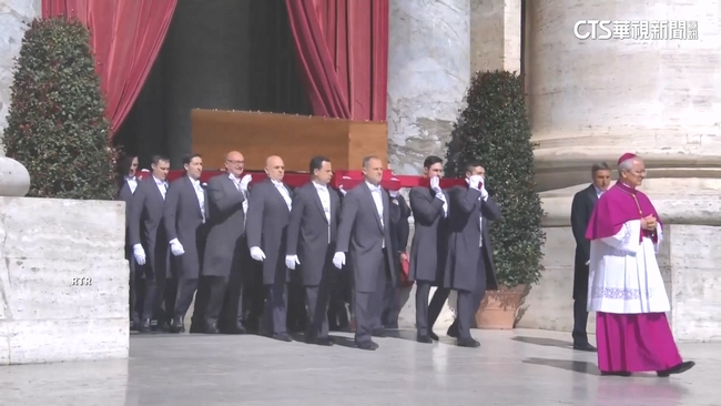教宗方濟各的靈柩被抬出聖伯多祿大殿,現場響起莊嚴的聖歌聲。外頭的聖伯多祿廣場上,聚集了約20萬群眾,前來送教宗最後一程。靈柩在眾人的注目下就位,喪禮彌撒隨後正式開始。